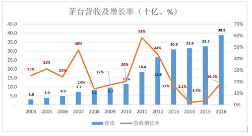 2004-2016年,茅臺營收平均年復合增長率為26.1%。這12年大致可分為兩段: