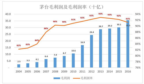 2004-2016年,茅臺毛利潤平均年復合增長率為24.8%,略低于營收增速。