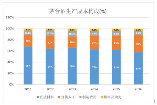 茅臺酒的生產(chǎn)成本包括原材料、人工、制造費用、燃料及動力四個部分。2011-2016年,直接材料占比從68%降至58%,直接人工占比則由20%增至30%。
