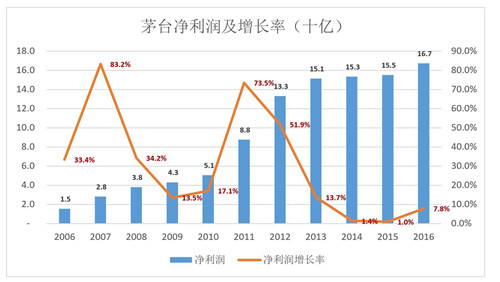 2006-2016年,茅臺營收平均年復合增長率為26.9%。但最近3年,凈利潤同比增幅都是“個位數(shù)”:1.4%、1.0%、7.8%……