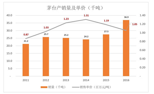 茅臺先后上馬“十一五”和“十二五”兩個萬噸茅臺酒工程。2011年,茅臺酒及系列酒基酒產(chǎn)量接近4萬噸:2016年達6萬噸(其中茅臺酒基酒為3.93萬噸);2016年產(chǎn)量為2005年產(chǎn)量的376%,年均復合增長率12.8%。