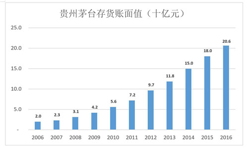 2005-2016年,貴州茅臺存貨賬面值年均復合增長率達24.4%,幾乎是產(chǎn)能擴張速度的一倍。