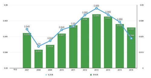 財報顯示,自2014年起,全食的凈利率、毛利率開始雙雙持續(xù)性走低,營收增長乏力。2016年,公司錄得收入157.24億美元,同比僅增2.17%,創(chuàng)下了7年新低,凈利潤5.07億美元,同比下降5.4%。