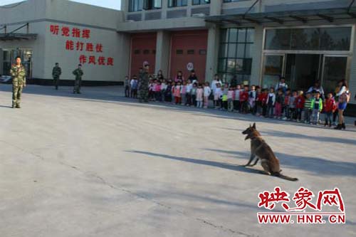 在老師和消防隊(duì)員的帶領(lǐng)下,孩子們有秩序地參觀。首先參觀了一樓車庫,孩子們被消防車以及車上的先進(jìn)裝備深深吸引,消防員叔叔耐心細(xì)致地為孩子們講解消防車上的小秘密:高壓水槍、防毒面罩、氧氣瓶、急救箱、云梯、泡沫噴射槍、定位器、呼救器等消防裝備,使孩子們開了眼界。消防隊(duì)員還用淺顯的語言向孩子們介紹了消防常識:火災(zāi)的危害、火災(zāi)的預(yù)防、火災(zāi)發(fā)生時(shí)的逃生自救、消防器械的使用、消防服的穿戴等等。接著孩子們參觀了二樓的消防員宿舍、圖書室、會議室、體育活動室等,更深入地了解了消防員的學(xué)習(xí)生活,更加走近消防員。最后,消防員為孩子們帶來了精彩的警犬搜救表演,孩子們興高采烈,不約而同為消防員叔叔鼓掌叫好!