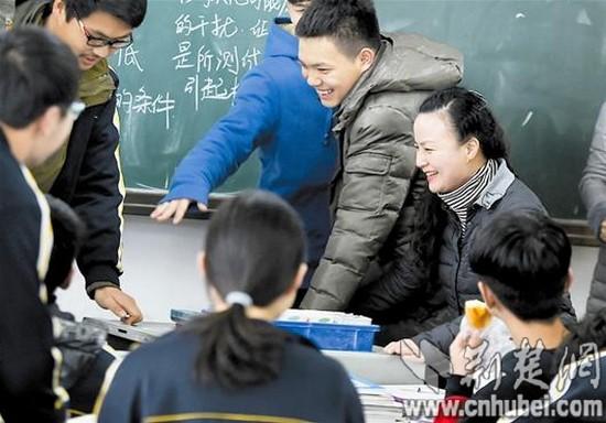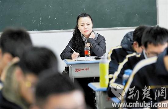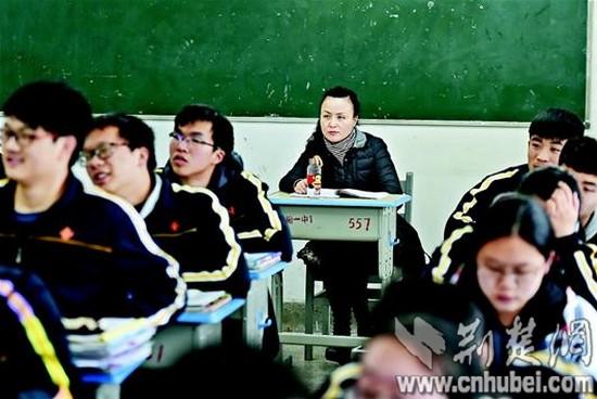 9日上午10時(shí)30分許,記者首先來(lái)到漢陽(yáng)一中高二(15)班。這是一堂歷史課,老師講得神采飛揚(yáng),同學(xué)們聽(tīng)得津津有味。教室最后一排坐著一位中年女士,時(shí)而認(rèn)真聽(tīng)講,時(shí)而埋頭記筆記。