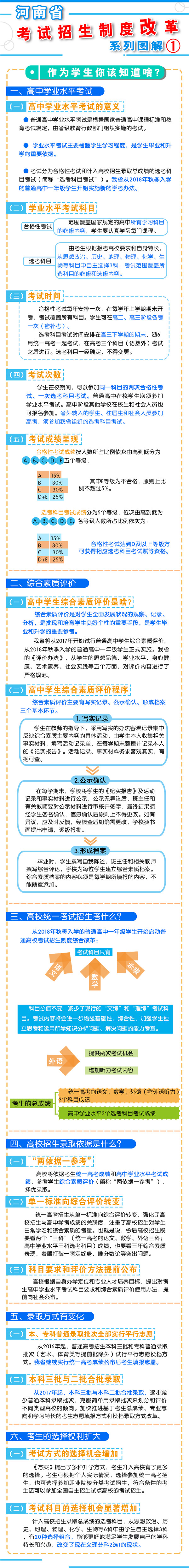 一、促進(jìn)升學(xué)機(jī)會(huì)公平 逐步增加我省考生接受優(yōu)質(zhì)高等教育的機(jī)會(huì),逐步增加農(nóng)村學(xué)生升入重點(diǎn)高校人數(shù),減少和規(guī)范高考加分,完善中小學(xué)招生辦法?! ?strong>二、改革考試形式和內(nèi)容 完善高中學(xué)業(yè)水平考試??荚嚪譃楹细裥钥荚嚭陀?jì)入高校招生錄取總成績(jī)的選考科目考試(簡(jiǎn)稱“選考科目考試”)。合格性考試范圍覆蓋國(guó)家規(guī)定的高中所有學(xué)習(xí)科目的必修內(nèi)容。選考科目由考生根據(jù)報(bào)考高校要求和自身特長(zhǎng),從思想政治、歷史、地理、物理、化學(xué)、生物等科目中自主選擇3科。學(xué)生在校期間,可以參加同一科目的兩次合格性考試、一次選考科目考試?! ∵M(jìn)一步規(guī)范高中學(xué)生綜合素質(zhì)評(píng)價(jià)。建立全省規(guī)范統(tǒng)一的高中學(xué)生綜合素質(zhì)檔案,完善學(xué)生綜合素質(zhì)評(píng)價(jià)電子化管理平臺(tái),客觀記錄學(xué)生成長(zhǎng)過程中的真實(shí)表現(xiàn),確保程序嚴(yán)格、公開透明、內(nèi)容真實(shí)可信。 推進(jìn)高職院校分類考試。高職院校(含高等??茖W(xué)校)考試招生與普通高校相對(duì)分開,實(shí)行“文化素質(zhì)+職業(yè)技能”評(píng)價(jià)方式。中職(含技校)畢業(yè)生報(bào)考高職院校,參加文化基礎(chǔ)和專業(yè)技能相結(jié)合的測(cè)試。普通高中畢業(yè)生報(bào)考高職院校,參加職業(yè)適應(yīng)性測(cè)試,文化素質(zhì)成績(jī)使用高中學(xué)業(yè)水平考試成績(jī),參考綜合素質(zhì)評(píng)價(jià)?! ∩罨荚噧?nèi)容改革。依據(jù)國(guó)家高中課程標(biāo)準(zhǔn)和高校人才選拔、培養(yǎng)要求,科學(xué)設(shè)計(jì)命題內(nèi)容,增強(qiáng)基礎(chǔ)性、綜合性,突出能力、創(chuàng)新導(dǎo)向,著重考察學(xué)生獨(dú)立思考和運(yùn)用所學(xué)知識(shí)分析問題、解決問題的能力?! ?strong>三、改革招生錄取機(jī)制 完善招生選拔機(jī)制。高校要合理確定考試招生的標(biāo)準(zhǔn)、條件、程序等內(nèi)容,在招生章程中詳細(xì)列明并提前向社會(huì)公布。要加強(qiáng)學(xué)校招生委員會(huì)建設(shè),充分發(fā)揮其在重大招生事項(xiàng)中的作用。建立考試錄取申訴機(jī)制和招生問責(zé)制,校長(zhǎng)對(duì)錄取結(jié)果負(fù)責(zé)?! 「母镤浫》绞?。從2017年起,本科三批與本科二批合批錄取,逐步減少普通本科錄取批次,克服簡(jiǎn)單用錄取批次來劃分和評(píng)價(jià)不同類型高校的傾向。加快推進(jìn)基于考生總成績(jī)、專業(yè)志向和學(xué)習(xí)特長(zhǎng)的考生志愿填報(bào)方式和投檔錄取方式改革?! ?strong>四、改革監(jiān)督管理機(jī)制 加強(qiáng)信息公開,全面實(shí)施高校招生“陽光工程”,進(jìn)一步擴(kuò)大信息公開的范圍和內(nèi)容。強(qiáng)化考試安全,堅(jiān)持從嚴(yán)治考,完善考試招生誠(chéng)信制度,落實(shí)誠(chéng)信結(jié)果使用要求。加大違規(guī)查處力度,加強(qiáng)考試招生全程監(jiān)管,嚴(yán)厲打擊和嚴(yán)肅查處考試招生中的違法違規(guī)行為,及時(shí)公布查處結(jié)果,嚴(yán)格責(zé)任追究?! ?strong>五、2018年秋季開始實(shí)施 從2018年秋季入學(xué)的普通高中一年級(jí)學(xué)生開始啟動(dòng)普通高??荚囌猩贫染C合改革?! ≡诟母锟荚嚳颇吭O(shè)置上,不分文理科,外語科目提供兩次考試機(jī)會(huì)。考生的總成績(jī)由統(tǒng)一高考的語文、數(shù)學(xué)、外語(含外語聽力)3個(gè)科目成績(jī)和高中學(xué)業(yè)水平3個(gè)選考科目考試成績(jī)組成。保持統(tǒng)一高考的語文、數(shù)學(xué)、外語分值不變?! ≡诟母镎猩浫C(jī)制上,推進(jìn)基于統(tǒng)一高考成績(jī)和高中學(xué)業(yè)水平考試成績(jī)、參考學(xué)生綜合素質(zhì)評(píng)價(jià)的多元錄取機(jī)制改革。高校要根據(jù)自身辦學(xué)定位和專業(yè)人才培養(yǎng)目標(biāo),提出對(duì)考生高中學(xué)業(yè)水平考試科目要求和綜合素質(zhì)評(píng)價(jià)使用辦法,提前向社會(huì)公布。 2016年省教育行政部門出臺(tái)普通高中學(xué)業(yè)水平考試實(shí)施辦法和普通高中學(xué)生綜合素質(zhì)評(píng)價(jià)實(shí)施辦法,從2018年秋季入學(xué)的普通高中一年級(jí)學(xué)生開始正式實(shí)施?! ?strong>省教育廳文件通知: 1、關(guān)于印發(fā)《河南省普通高中學(xué)業(yè)水平考試實(shí)施辦法(試行)》的通知 2、關(guān)于印發(fā)《河南省普通高中學(xué)生綜合素質(zhì)評(píng)價(jià)實(shí)施辦法(試行)》的通知