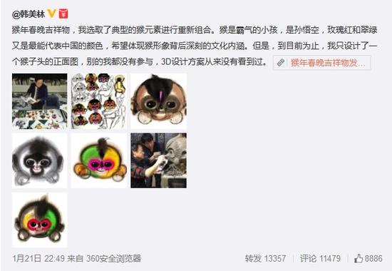 春晚吉祥物康康由“福娃”的創(chuàng)作者之一韓美林設計,官方稱是以中國傳統(tǒng)水墨畫的藝術形式,生動表現(xiàn)出“猴”的機靈活潑特點??纯错n老師的手稿,也是能get到喜慶的氛圍和毛茸茸的手感,還算是只討人喜愛的猴子↓
