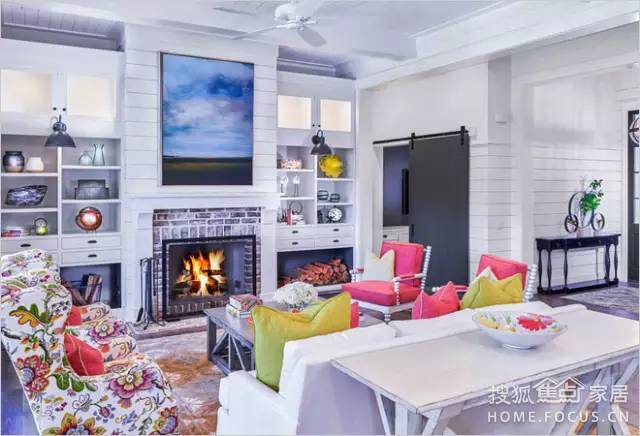 幾個沙發(fā)和壁爐圍在一起,看上去暖暖的。另外,壁爐也能起到輔助照明的作用。