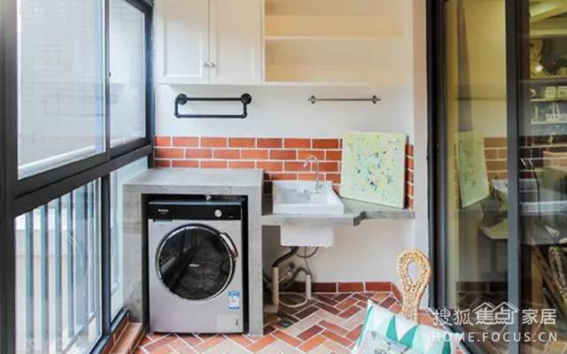 這是一款青春活潑的陽臺,地面和墻面都是復(fù)古紅磚風(fēng)格,加上配合洗衣機的盥洗區(qū)下方的管道直接暴露出來,顯得十分自由隨意,洗衣機上方懸掛的兩個晾曬架,可以用來掛毛巾、小衣物等,這樣的陽臺洗衣機角落實用又有格調(diào),適合年輕人。