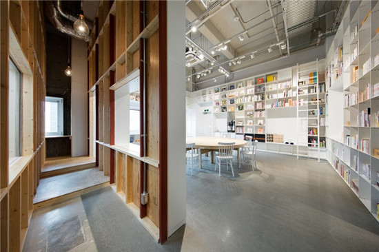 這個(gè)建筑工作室通過創(chuàng)建一個(gè)既包括圖書館,另外還有一個(gè)蛋糕店的空間來完成人們輕松聚集在一起這個(gè)愿望??此坪敛幌嚓P(guān)的兩個(gè)空間,只要提供了一個(gè)聚集區(qū),就形成了一個(gè)互動,兩者就聯(lián)系在了一起。