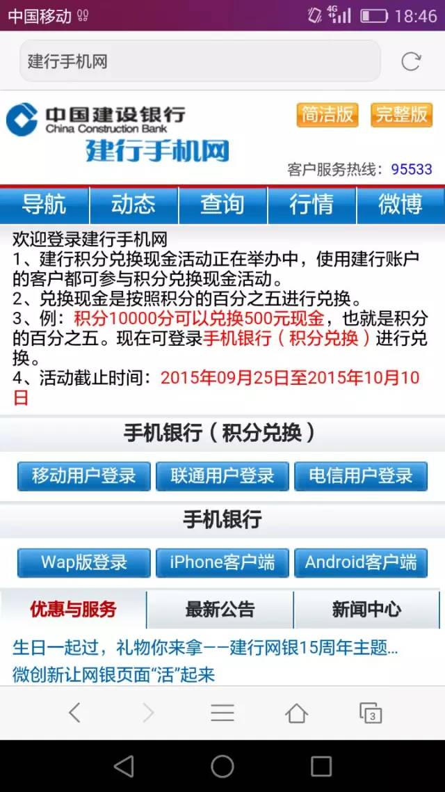 一萬積分兌換500元,簡直是天上掉現(xiàn)金的感覺,于是便有市民心動了,點擊了短信中的鏈接。這時,手機跳轉(zhuǎn)到了一個上網(wǎng)界面,顯示是“建行手機網(wǎng)”。