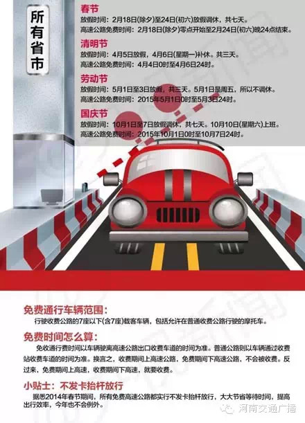2015年春節(jié)放假安排時(shí)間表已經(jīng)出爐,春節(jié)高速公路免費(fèi)時(shí)間具體從哪天開(kāi)始?持續(xù)多長(zhǎng)時(shí)間?哪些車(chē)型可以免費(fèi)通行?