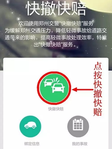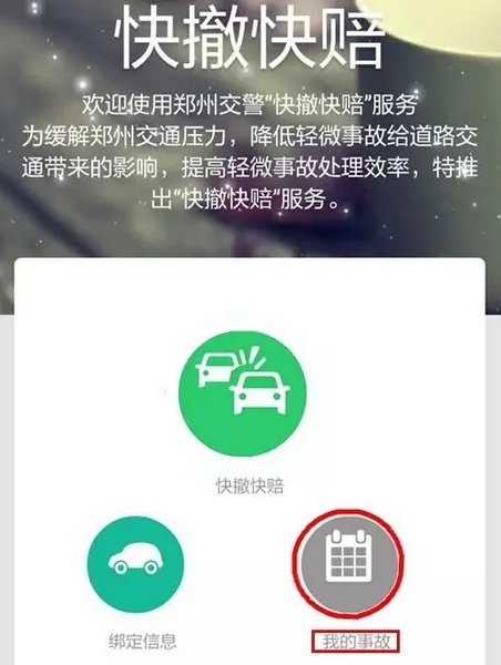 4、適用范圍:交警二大隊轄區(qū)內(nèi)嵩山路(含)嵩山路以西區(qū)域及中原區(qū)、西開發(fā)區(qū)全境,公共道路上發(fā)生的兩車事故,車輛能夠正常駕駛,沒有人員受傷,均適用。