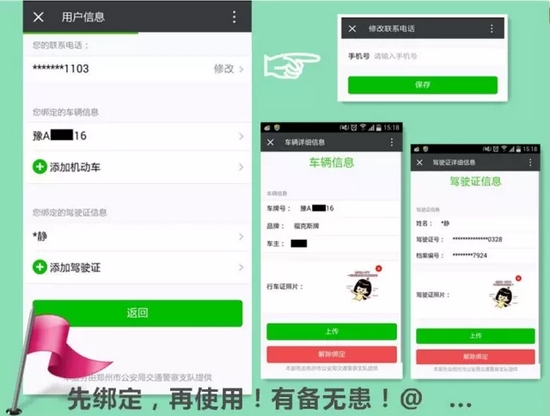 分別填寫:聯(lián)系電話、綁定車輛信息、綁定駕駛證信息確認(rèn)無誤后按確定保存。