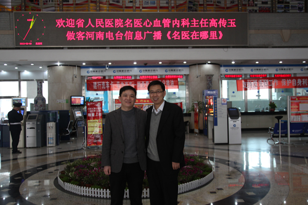 開播第一天做客節(jié)目的嘉賓省人民醫(yī)院心血管內科主任高傳玉與河南電臺信息廣播總監(jiān)李金鋒合影