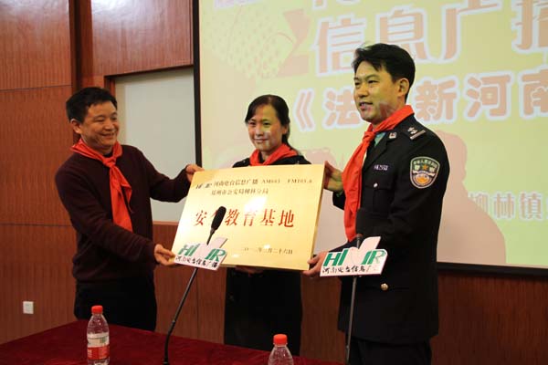 3月26日下午,我省首家電臺“中小學(xué)安全教育基地”掛牌儀式在鄭州市金水區(qū)柳林鎮(zhèn)第四小學(xué)舉行。河南電臺信息廣播總監(jiān)李金鋒、鄭州市公安局柳林分局局長姬勇斌,將“安全教育基地”的銘牌交到柳林鎮(zhèn)第四小學(xué)黨支部書記楊麗麗手中。