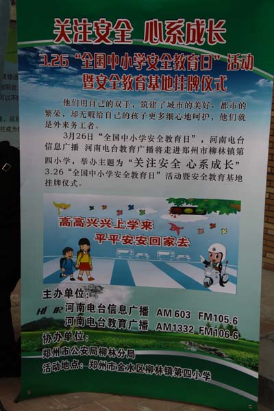 2012年3月26日是第十七個“全國中小學(xué)安全教育日”,在教育日當(dāng)天舉行“中小學(xué)安全教育基地”掛牌儀式,河南電臺信息廣播依托日常欄目《法制新河南》的整合資源,將中小學(xué)安全宣傳教育常態(tài)化。據(jù)河南電臺信息廣播總監(jiān)李金鋒介紹,“教育基地建立以后,河南電臺信息廣播將聯(lián)合鄭州市公安局柳林分局,通過信息廣播AM603、FM105.6廣播頻率,以《法制新河南》欄目為陣地,長期持久的宣傳中小學(xué)安全教育知識,并為柳林鎮(zhèn)第四小學(xué)的學(xué)生提供書籍、器械等安全教育的物品,節(jié)目主持人和柳林分局的警官還將不定期的深入校園內(nèi),跟學(xué)生們面對面的交流、一對一的輔導(dǎo)?!?br />   作為中原地區(qū)開播較早、覆蓋最廣、影響較大的頻率,河南電臺信息廣播在2012年開始了節(jié)目轉(zhuǎn)型升級,以“民生零距離,健康新生活”為宗旨,全方位服務(wù)河南百姓,服務(wù)中原民生。這次來到金水區(qū)柳林鎮(zhèn)第四小學(xué),除了舉行“中小學(xué)安全教育基地”掛牌儀式,《法制新河南》欄目還將直播間搬到了學(xué)校,以主持人、嘉賓、學(xué)生一起上節(jié)目的形式,用寓教于樂的方式和學(xué)生家長們互動。