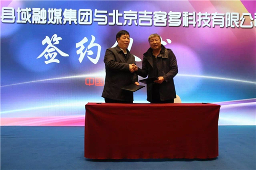 ▲河南電視臺新農(nóng)村頻道張克宣總監(jiān)與北京吉客多科技有限公司總經(jīng)理周宏志進行簽約