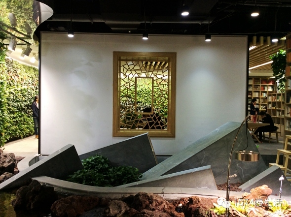書架間隙,大片的綠色植被,墻上全都是鮮活的植物,目之所及,除了書,就是綠色。