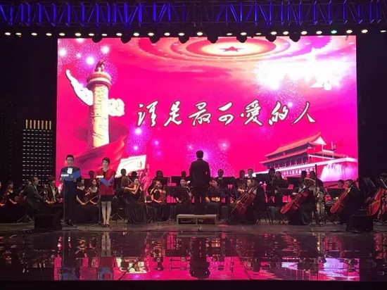伴隨臺(tái)上指揮黃俊博的手勢(shì)起,河南愛樂樂團(tuán)開始演奏交響樂《紅旗頌》。