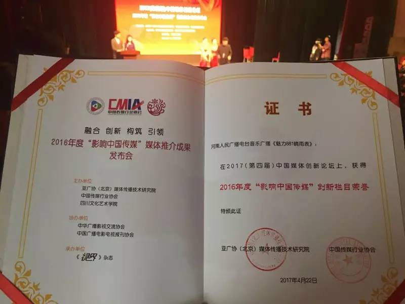 我們魅力881河南音樂廣播獲得2016年度”影響中國(guó)傳媒“最具創(chuàng)新力媒體獎(jiǎng),《魅力881晴雨表》獲得2016年度“影響中國(guó)傳媒”創(chuàng)新欄目獎(jiǎng),DJ 陽(yáng)陽(yáng)出席論壇及典禮,與來自全國(guó)的媒體同仁進(jìn)行交流,分享廣播影視產(chǎn)業(yè)的寶貴經(jīng)驗(yàn)。