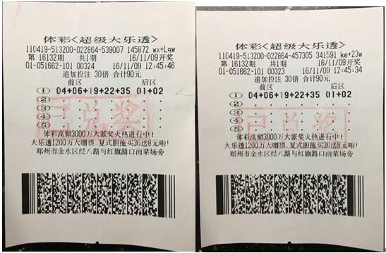 11月9日,中國體育彩票超級大樂透第16132期開獎,當(dāng)期開獎號碼為04 18 19 22 35+01 02,四川彩民和浙江彩民分別將追加投注一等獎1600萬元和基本投注一等獎1000萬元收入囊中。