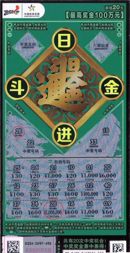 “日進(jìn)斗金”面值20元,共有三個(gè)游戲。游戲一和游戲二,刮開覆蓋膜,如果出現(xiàn)金額標(biāo)志,即中得該金額;游戲三:刮開覆蓋膜,如果你的號(hào)碼中任意一個(gè)號(hào)碼與中獎(jiǎng)號(hào)碼之一相同,即中得該號(hào)碼下方所示的金額;如果出現(xiàn)銅錢標(biāo)志,即中得該標(biāo)志下方所示金額的3倍;如果出現(xiàn)元寶標(biāo)志,即中得該標(biāo)志下方所示金額的5倍。