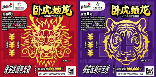 本次上市的“臥虎藏龍”主題即開套票,共有5元、10元、20元三種面值。票面設(shè)計(jì)色彩濃郁、霸氣美觀,“虎頭”、“龍頭”標(biāo)識躍然于票面正中,“眼神”犀利且極富“挑戰(zhàn)”意味,寓意充滿自信,敢于挑戰(zhàn)最高獎(jiǎng)金。