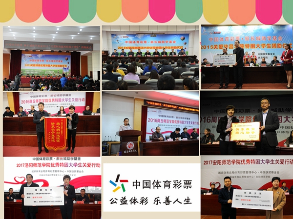 河南省體育彩票管理中心自2013年開始,已經(jīng)連續(xù)五年通過國家體育總局體育彩票管理中心與中國扶貧基金會合作,以“中國體育彩票·新長城助學基金”形式,向信陽師范學院、河南師范大學、許昌學院、商丘師范學院、周口師范學院、洛陽師范學院、安陽師范學院共計7所院校的400名優(yōu)秀貧困大學生累計捐助助學金200萬元。2015年,河南體彩中心在前兩年每年捐助50名貧困大學生的基礎(chǔ)上,將受助名額增加到了60名,2016年開始又將捐贈學校從一所增加到兩所,受助學生名額從60名又增加到120名,每個學生的受助金額從4000元提高到了5000元,希望幫助更多的困難學生及其家庭減輕經(jīng)濟負擔和精神壓力。