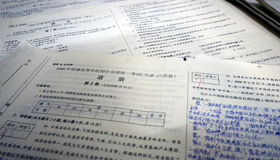甘福保說,收藏高考試卷是一種情懷,他會(huì)一直堅(jiān)持下去。圖為甘福保收藏的高考試卷。