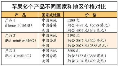 另外,剛剛上市的iPad mini,其wifi版的16G在美國(guó)市場(chǎng)僅為2047人民幣(329美元),大大低于中國(guó)內(nèi)地市場(chǎng)同款式的2498元人民幣。即使與前幾代價(jià)格沒(méi)有變化的ipad 4,其16G的wifi版在美國(guó)也只要3104元人民幣(499美元),中國(guó)香港市場(chǎng)為3122元人民幣(3888港元),而中國(guó)內(nèi)地市場(chǎng)卻要3688元人民幣。