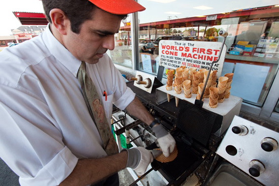 諾??耸械亩宫敱ち璧?Doumar's)因艾比?豆瑪在1904年的圣路易斯世界展覽會上發(fā)明了美國第一支蛋卷冰激凌而聞名于世。嘗一下百年蛋卷機(jī)做出來的冰激凌,還是那古老而甜蜜的味道。