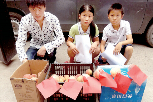 12日9時許,西三環(huán)建設路口東南角,一箱箱桃子從面包車上搬下,陳國西和兒子陳揚細心地將“媽媽兒子想你”6張紅紙貼在桃子上。