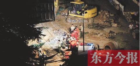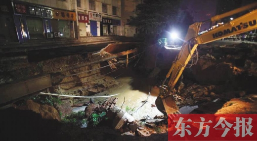 昨日21:26許,現(xiàn)場(chǎng)調(diào)來一輛挖土機(jī),開始路面開挖施救。據(jù)市政部門介紹,塌方約600平方米,長(zhǎng)約30米、寬約20米,深四五米。