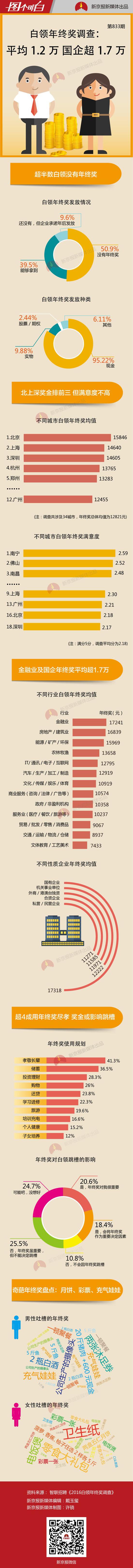 春節(jié)將至,“年終獎(jiǎng)”又成了眾人關(guān)注的話題。近日,智聯(lián)招聘發(fā)布《2016白領(lǐng)年終獎(jiǎng)?wù){(diào)查》,調(diào)查通過對(duì)11526份有效問卷分析顯示,涉及的34城市年終獎(jiǎng)總體均值為12821元。其中,北京最高,為15846元,上海和深圳次之。不過,三個(gè)城市的白領(lǐng)對(duì)年終獎(jiǎng)的滿意度并不是很高。