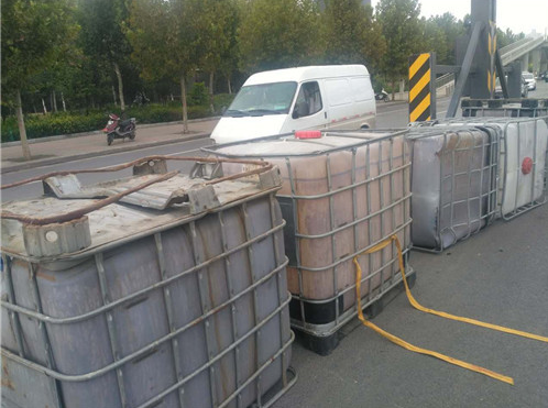 據(jù)貨車司機介紹,他車上拉的這些邊長約1米的方形大桶是裝醬油用的,當天拉著這些空桶從新鄭來到鄭州,因?qū)β窙r不熟,不知道此處上橋口有3米的限高桿,直到上橋時撞上限高桿后,才知道貨車不讓上三環(huán)立交橋。