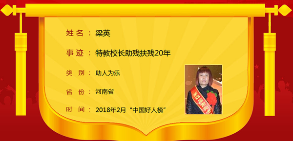 大河網(wǎng)訊 3月4日,2018年2月“中國好人榜”發(fā)布,共有101位助人為樂、見義勇為、誠實守信、敬業(yè)奉獻、孝老愛親的身邊好人榮登該榜,河南省共有6位好人光榮上榜。他們分別是助人為樂好人:助殘扶殘20年的特教校長梁英。見義勇為好人:冬夜聯(lián)手相救落水老人的基層干部韓俊杰、李紅衛(wèi)。敬業(yè)奉獻好人:細心照料老人10余年的愛心男護理蔣禹成。孝老愛親好人:照顧腦梗丈夫不離不棄,撫養(yǎng)2個侄子成才的好妻子趙四妮;30年悉心照料智障小姑的好嫂娘單二服。
