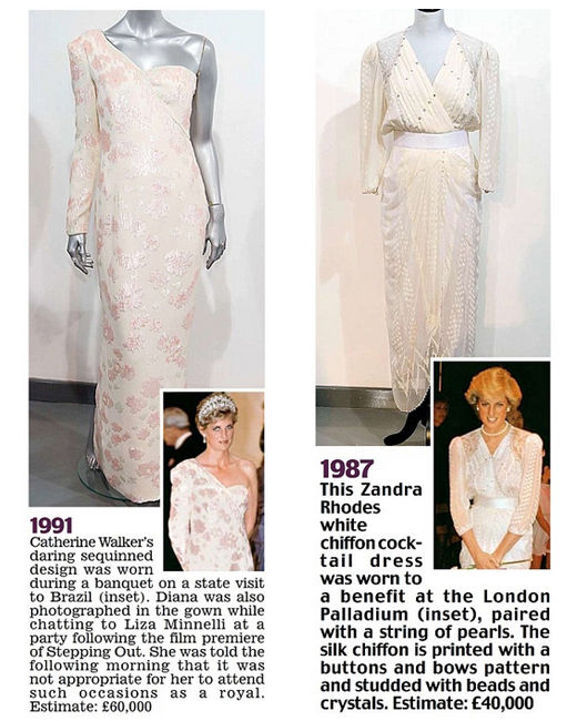 右:Zandra Rhodes白色雪紡禮服。1987年5月,戴安娜王妃穿著這條禮服在倫敦出席公益活動(dòng)。估價(jià):4萬(wàn)英鎊