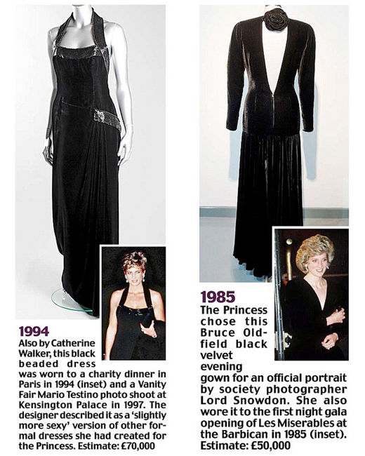 左:Catherine Walker黑色天鵝絨禮服。1997年,攝影大師Mario Testino為戴安娜王妃在肯辛頓宮拍攝的《名利場(chǎng)》大片中,她就穿著這件禮服。估價(jià):7萬(wàn)英鎊