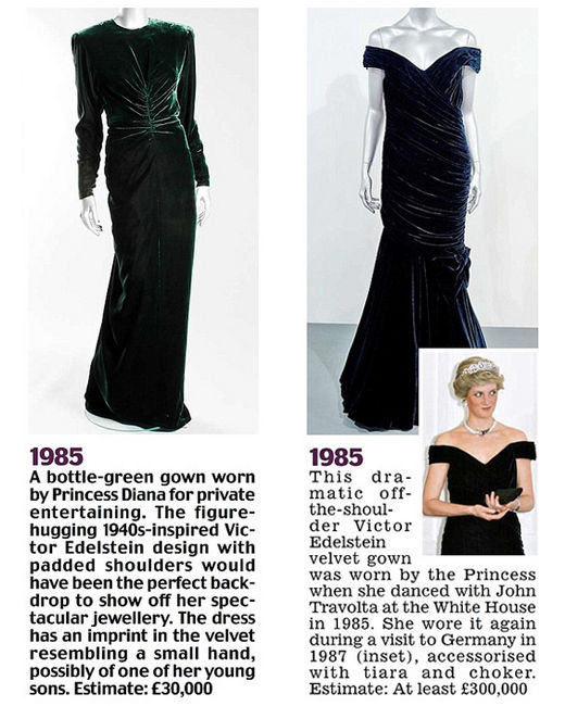 左:Victor Edelstein綠色天鵝絨禮服。1985年出席私人聚會(huì)時(shí),戴安娜王妃穿著這條禮服。估價(jià):3萬(wàn)英鎊