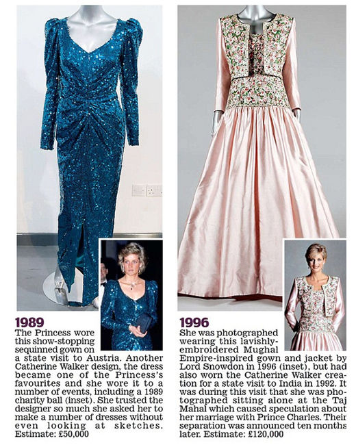 左:Catherine Walker深海綠色亮片禮服。1989年戴安娜王妃穿著該禮服在奧地利進(jìn)行國(guó)事訪(fǎng)問(wèn)。估價(jià):5萬(wàn)英鎊