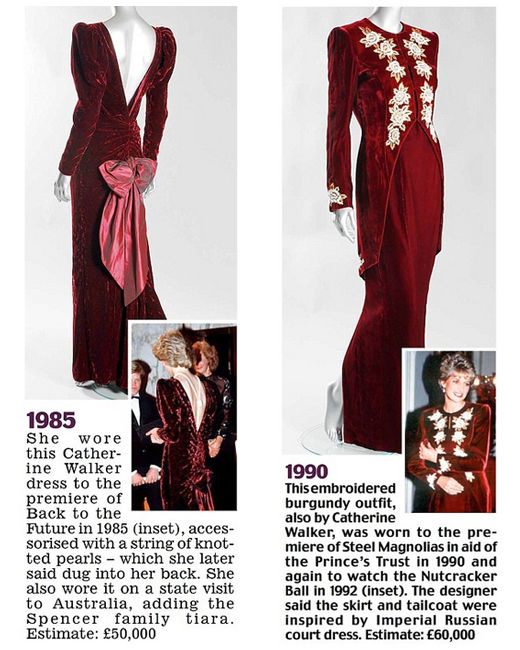左:Catherine Walker酒紅色天鵝絨禮服。戴安娜王妃曾穿著它訪(fǎng)問(wèn)澳大利亞,1985年出席電影《回到未來(lái)》的首映禮時(shí)也同樣穿的這件禮服。估價(jià):5萬(wàn)英鎊