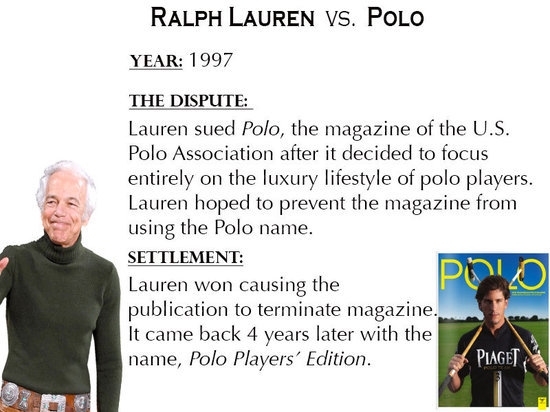 結(jié)果:Ralph Lauren贏得訴訟,但是美國(guó)馬球協(xié)會(huì)雜志在四年后用“Polo Players”的名稱開始生產(chǎn)馬球運(yùn)動(dòng)配件