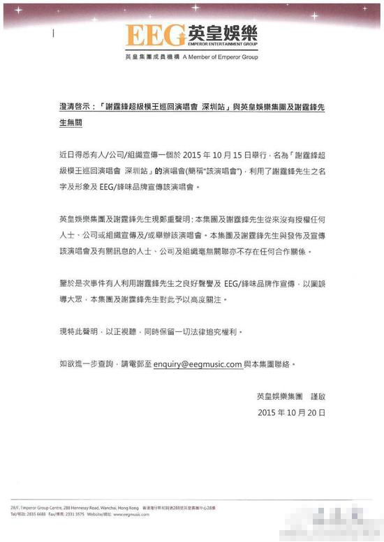 謝霆鋒經(jīng)紀人霍汶希表示“本集團及謝霆鋒先生從來沒有授權任何人士、公司或組織宣傳或舉辦該演唱會。本集團及謝霆鋒先生于發(fā)布及宣傳該演唱會及有關訊息的人士、公司及組織毫無關系,不存在任何合作關系?!币悦夥劢z受騙,同時保留一切法律追究權利。