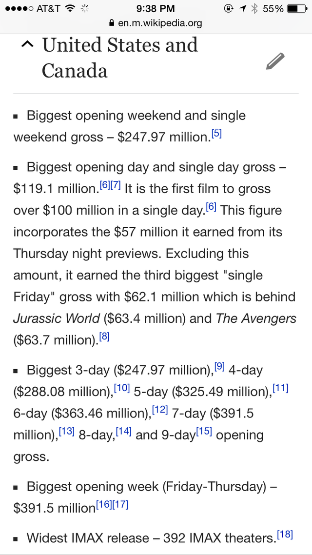 截圖只占該詞條的五分之一都不到哦,這齊刷刷的一片 Biggest/ Widest 真是氣壯山河??!預(yù)計到本周末《星戰(zhàn)7》將在北美拿下5億票房,比前任紀(jì)錄保持者《侏羅紀(jì)世界》快了近整整一倍之多!”票房記錄粉碎機(jī)“之稱果然名副其實(shí)!