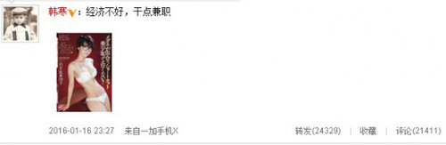1月16日晚,韓寒在微博曬出一張與自己撞臉的女優(yōu)的照片,并寫道:“經(jīng)濟不好,干點兼職??吹秸掌缶W(wǎng)友紛紛留言調(diào)侃,“帥,不解釋”、“你把岳父甩開幾條街”、“岳父的發(fā)卡好好看”、“岳父從硬漢到軟妹的蛻變”。