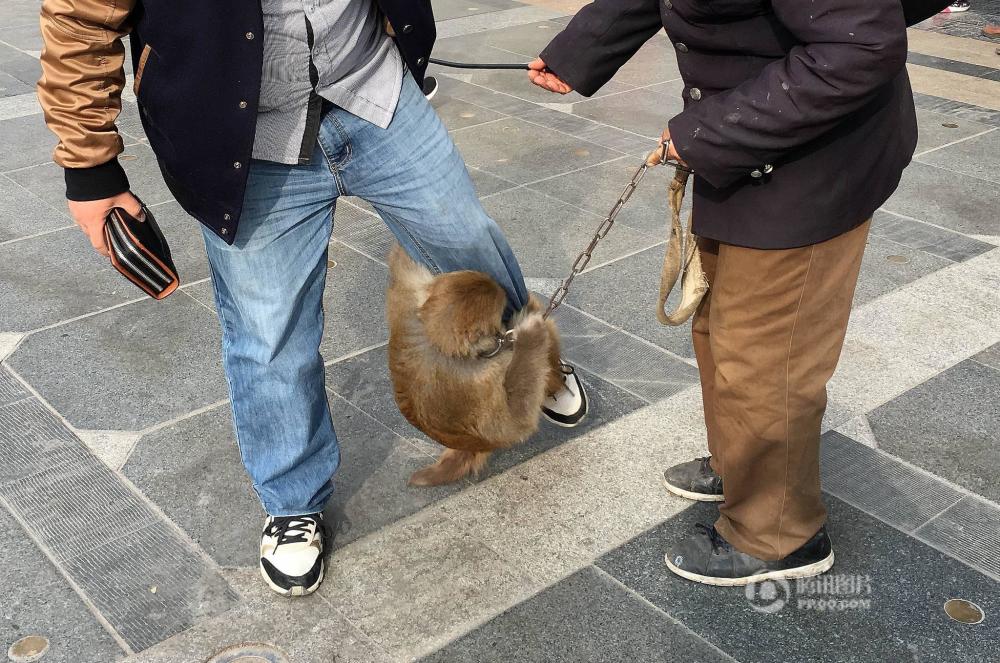 2016年12月11日,在合肥一公園門口,有幾只猴子在主人的指令下,緊緊抱住行人的腿部,幫主人討要1元“擁抱費”,如對方不給則緊抱不放。馬方/視覺中國