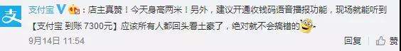 對(duì)此,支付寶官方表示,建議開通收錢碼語(yǔ)音播報(bào)功能,現(xiàn)場(chǎng)就能聽到“支付寶到賬7300元”,應(yīng)該所有人都回頭看土豪了,絕對(duì)就不會(huì)搞錯(cuò)的。