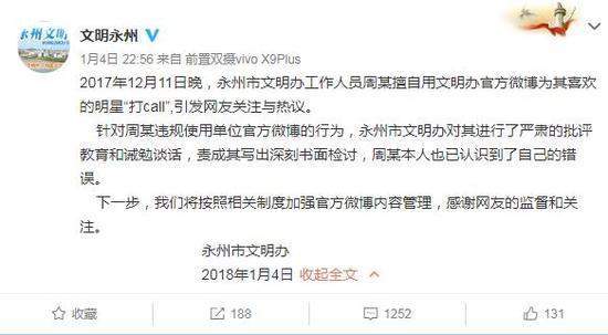 湖南省永州市文明辦官方微博:2017年12月11日晚,永州市文明辦工作人員周某擅自用文明辦官方微博為其喜歡的明星“打call”,引發(fā)網(wǎng)友關注與熱議。針對周某違規(guī)使用單位官方微博的行為,永州市文明辦對其進行了嚴肅的批評教育和誡勉談話,責成其寫出深刻書面檢討,周某本人也已認識到了自己的錯誤。