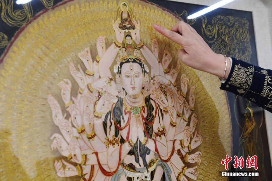 4月7日,蘭州文理學(xué)院女教師白茜介紹自己用萬(wàn)根金屬絲創(chuàng)作出的“千手千眼觀音”掐絲琺瑯畫(huà)。從小喜歡繪畫(huà)的白茜通過(guò)自己十幾年的摸索,以敦煌壁畫(huà)為范本制作掐絲琺瑯畫(huà)?!扒智а塾^音”是白茜最滿意的作品,用了萬(wàn)根一米左右的金屬絲臨摹完成。